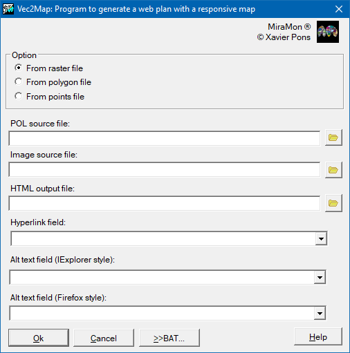 This application generates a web page with an interactive image map from a VEC file of polygons, POL or PNT, and a raster image in GIF or JPG format. If working with a POL or PNT file, you can define the properties of the map's sensitive areas using metadata information.