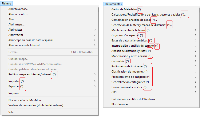 Aquellas MSA (o grupos de MSA) que utilizan una interfaz Windows y que están presentes en los menús de MiraMon, aparecen marcadas con un (*). Esto informa a la persona usuaria de, por una parte, se trata de funcionalidades implementadas como aplicaciones externas (y que, si se desea, pueden formar parte de un metaprograma o proceso BAT), y de, por otra parte, que las entradas y salidas de estas aplicaciones son totalmente independientes de los ficheros visualizados en aquel momento con MiraMon. Por ejemplo, si ejecuta una corrección geométrica sobre una banda radiométrica de un sensor de satélite, no visualizará los resultados hasta que no ejecute el comando "Abrir Ráster " del menú Fichero, una vez finalizado el proceso de corrección.