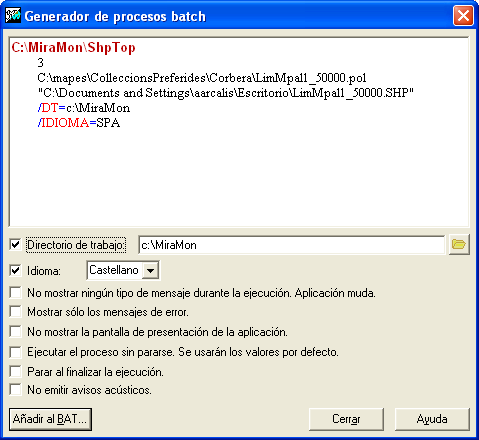 El generador de procesos batch visualiza la línea de comandos actual, construida cómodamente desde la interface Windows, de una forma clara y diferenciada. Proporciona una forma sencilla de manipular la línea de comandos para modificar los parámetros de sintaxis general, como por ejemplo, el Directorio de trabajo.