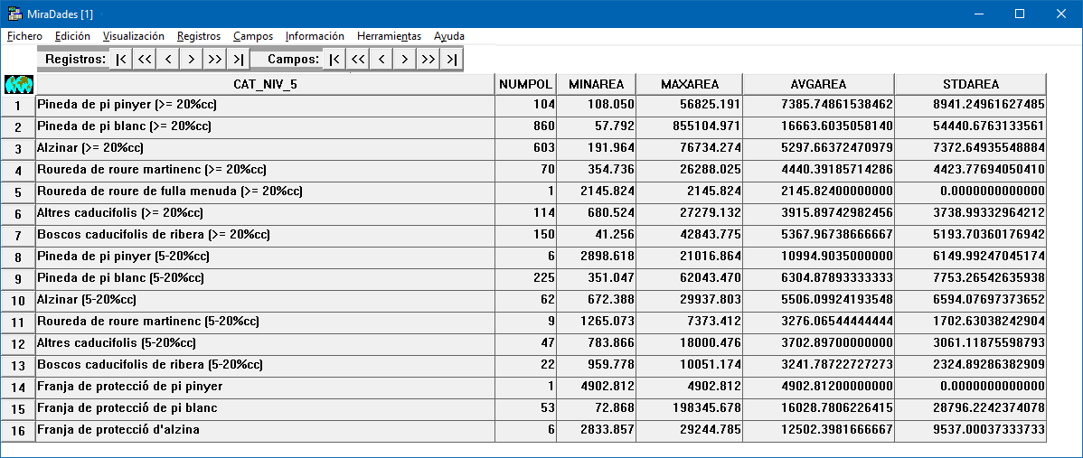 ![]() Bases de datos alfanuméricasEl apartado de organización espacial incluye un conjunto de aplicaciones que permiten realizar operaciones tales como la visualización y edición de tablas, la gestión y mantenimiento de los registros, la selección de subconjuntos de entidades vectoriales o el cálculo de estadísticas de campos y grupos de registros. Estas funcionalidades permiten analizar y procesar la información de forma estructurada, garantizando su coherencia y fiabilidad para diferentes ámbitos de aplicación. Visualización y edición de Tablas de Bases de DatosMiraDades es un visor de tablas de bases de datos y un editor de tablas DBF. Es una aplicación Windows que forma parte del desarrollo de MiraMon. La aplicación es fácil de usar porque utiliza una visualización similar a la de los visores de hojas de cálculo en las que las filas son los registros de las tablas y las columnas son los campos de la tabla. Con MiraDades se puede editar el contenido de la tabla, reestructurar campos o registros, ordenar la tabla, realizar un join físico y todas las operaciones básicas necesarias en un sistema de información geográfica. Para más información en relación al funcionamiento del programa, la sintaxis, etc, se puede consultar MiraDades: Visualización y edición de Tablas de Bases de Datos.