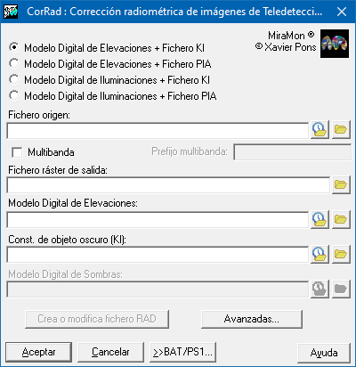 ![]() Corrección radiométricaLa aplicación permite corregir radiométricamente imágenes de teledetección captadas en las regiones espectrales visible e infrarrojo (no térmico). La corrección radiométrica permite reducir artefactos indeseados debidos a los efectos de la atmósfera o a la iluminación diferencial causada por la hora del día, el lugar de la Tierra o el relieve (zonas más o menos iluminadas, sombras, etc). El programa está directamente preparado para imágenes Landsat (MSS, TM, ETM+, OLI,...), SPOT (XS), Sentinel-2 (MSI), etc, y puede ser utilizado en prácticamente cualquier otro sensor espacial o aeroportado a través de ficheros de tipo RAD. Para más información en relación al funcionamiento del programa, la sintaxis, etc, se puede consultar CorRad: Corrección radiométrica de imágenes de Teledetección.