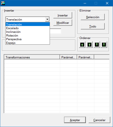 ![]() Abrir fichero de puntos de control (COR)La aplicación permite abrir el fichero de puntos de control que permiten realizar la corrección geométrica con la aplicación CorrGeom. Correcciones elementales (traslación, rotación, etc)La aplicación permite aplicar transformaciones geométricas tanto a rásters como a vectores, indicando los parámetros de la transformación que son conocidos a priori. Las operaciones que se ofrecen son: traslaciones, escalados, inclinaciones, rotaciones, perspectivas y espejos. Para más información en relación al funcionamiento del programa, la sintaxis, etc, se puede consultar CorrGeom: Corrección geométrica de ficheros ráster y vectoriales.