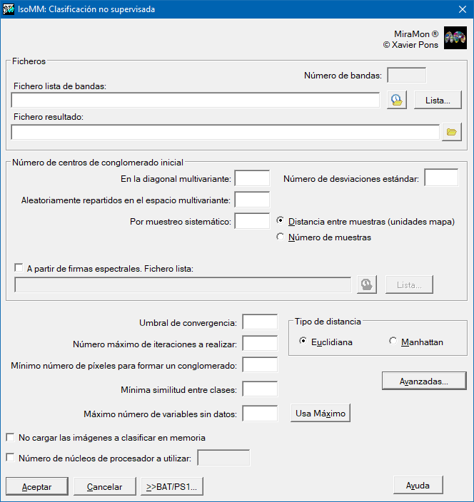 ![]() Clasificación no supervisadaEsta aplicación realiza una clasificación no supervisada de una imagen inspirada en el método clásico IsoData de Duda y Hart: Duda, RO, PE Hart (1973) "Pattern Classification and Scene Analysis", John Wiley and Sons, New York, [cap. 6, "Unsupervised Learning and Clustering", pp. 226-227]. En la implementación del clasificador en MiraMon (IsoMM), la aplicación empieza por un cierto número de categorías (clusters o conglomerados) sugerido por la persona usuaria. Para más información en relación al funcionamiento del programa, la sintaxis, etc, se puede consultar IsoMM: Clasificación no supervisada.