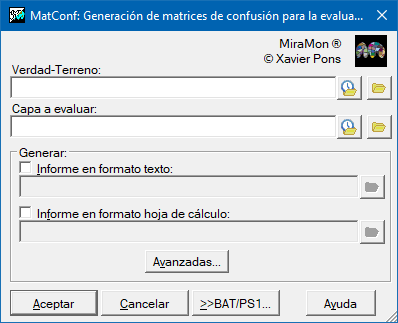 ![]() Generación de matrices de confusiónLa aplicación construye la 'Matriz de confusión', una tabla bidimensional de comparación de los datos de la imagen clasificada con los datos de referencia o verdad-terreno. El formato de salida puede ser un fichero de texto o un fichero en formato de hoja de cálculo (CSV). Para más información en relación al funcionamiento del programa, la sintaxis, etc, se puede consultar MatConf: Generación de matrices de confusión para la evaluación de cartografía temática.