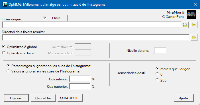 ![]() Optimización de histograma (global, local)La aplicación permite realizar una mejora de las imágenes optimizando globalmente el histograma o localmente a partir de una ventana de tamaño definido por la persona usuaria. Esta segunda opción da resultados mucho más contrastados, aunque es más lenta.
