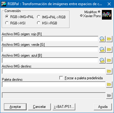 ![]() Transformaciones de espacio de color (24->8, HSI)La aplicación permite hacer transformaciones entre diferentes espacios de color. Por ejemplo puede transformar una imagen byte con paleta (codificación de color de 8 bits) a 3 imágenes byte separadas (canales R, G y B codificación de color de 24 bits). También puede convertir 3 imágenes byte que representan las bandas R, G y B a una imagen de 8 bits (byte) y una paleta optimizada, obtenida a partir del análisis de los colores más frecuentes y singulares presentes en las 3 imágenes originales; alternativamente, se puede generar la imagen de 8 bits usando una paleta predefinida. Para más información en relación al funcionamiento del programa, la sintaxis, etc, se puede consultar RGBPal: Transformación de imágenes entre espacios de colores.