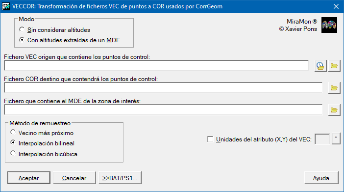 ![]() Conversión de VEC a puntos de control (COR)La aplicación permite la transformación de ficheros VEC de puntos a formato de trabajo de la aplicación CorrGeom la cual permite transformar ficheros procedentes de prácticamente cualquier escáner (formatos BMP, TIFF, JPG, etc) a formato IMG o JPG (si no lo eran en origen). Para más información en relación al funcionamiento del programa, la sintaxis, etc, se puede consultar VECCOR: Transformación de ficheros VEC de puntos a COR usados por CorrGeom.