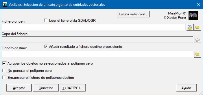 ![]() Selección de un subconjunto de entidades vectorialesLa aplicación permite seleccionar un subconjunto de objetos gráficos de un fichero de puntos, arcos, nodos, polígonos o grupos de polígonos y los guarda sobre un fichero de puntos, arcos, puntos, polígonos o grupos de polígonos respectivamente. Para más información en relación al funcionamiento del programa, la sintaxis, etc, se puede consultar VecSelec. Selección de un subconjunto de objetos gráficos vectoriales.