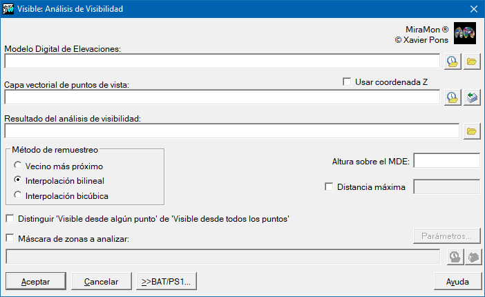 ![]() Análisis de visibilidadLa aplicación permite determinar, a partir del Modelo Digital de Elevaciones (MDE), qué píxeles son visibles y cuales no desde un conjunto de observadores o puntos de vista. En esta versión, los observadores tienen que ser objetos de tipo punto en formato estructurado PNT; pueden ser 3D y por tanto conocida su altura (puede ser sobre el terreno, como en una torre), o 2D y entonces se determina su altura a partir del MDE proporcionado. El cálculo de esta altura, así como las alturas de los puntos que determinan los perfiles topográficos, se puede hacer por el vecino más próximo, interpolación bilineal o interpolación bicúbica. Sobre la altura del observador, 3D o calculada, puede añadirse una altura complementaria (igual para todos los puntos) que eleve a los observadores con el objetivo de obtener un mejor campo de visualización. Para más información en relación al funcionamiento del programa, la sintaxis, etc, se puede consultar Visible: Análisis de visibilidad.