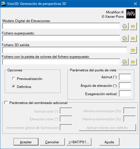 ![]() Generación de perspectivas 3DLa aplicación permite generar una perspectiva 3D a partir del modelo digital de elevaciones de cualquier imagen: temática, ortofotografía o cualquier modelo continuo como el propio MDE. Existen dos modos de ejecución: Previsualización y Definitiva. El modo de previsualización es más rápido que el definitivo y se recomienda para buscar los parámetros geométricos más próximos a la representación que se desea conseguir. Con la elección de este modo, no es posible activar la opción de sombreado. El modo definitivo es más lento pero genera una representación tridimensional de mayor calidad. Para más información en relación al funcionamiento del programa, la sintaxis, etc, se puede consultar Visio3D: Generación de perspectivas 3D a partir de un ráster y su MDE.