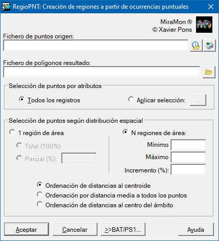 Parámetro de salida): Nombre del fichero destino de polígonos con las regiones generadas a partir de los puntos seleccionados. Puede ser en formato VEC o POL.